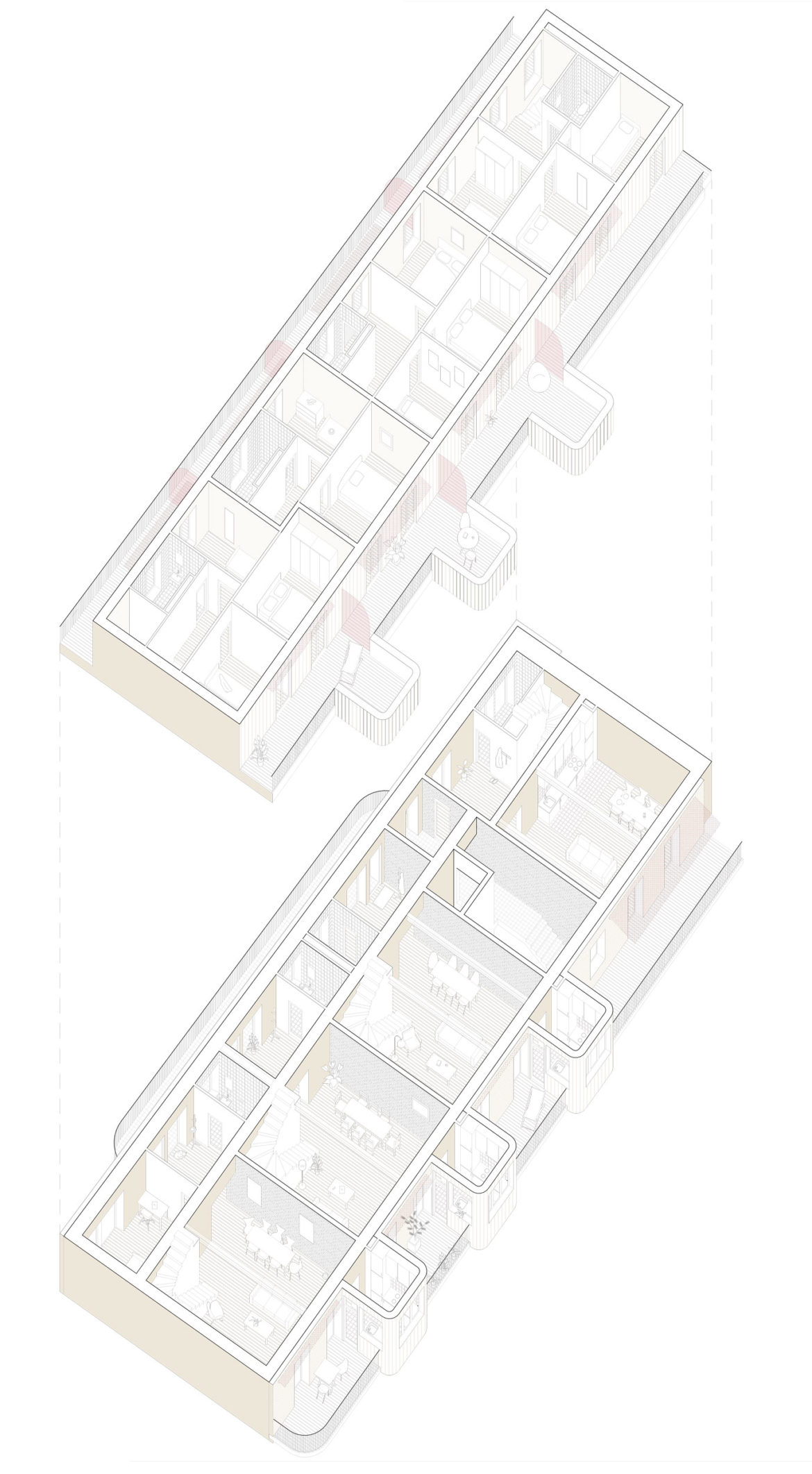 Du côté de la cour un socle en maçonnerie et des bow-windows contenant des cuisines et des balcons sont ajoutés devant la façade en respec- tant la position des fenêtres existantes. Ainsi, la trame des logements correspond à celle des ou- vertures dont les contre-cœurs sont supprimés pour constituer des portes-fenêtres. Côté rue les petites ouvertures sont agrandies pour offrir des perspectives traversantes aux logements.