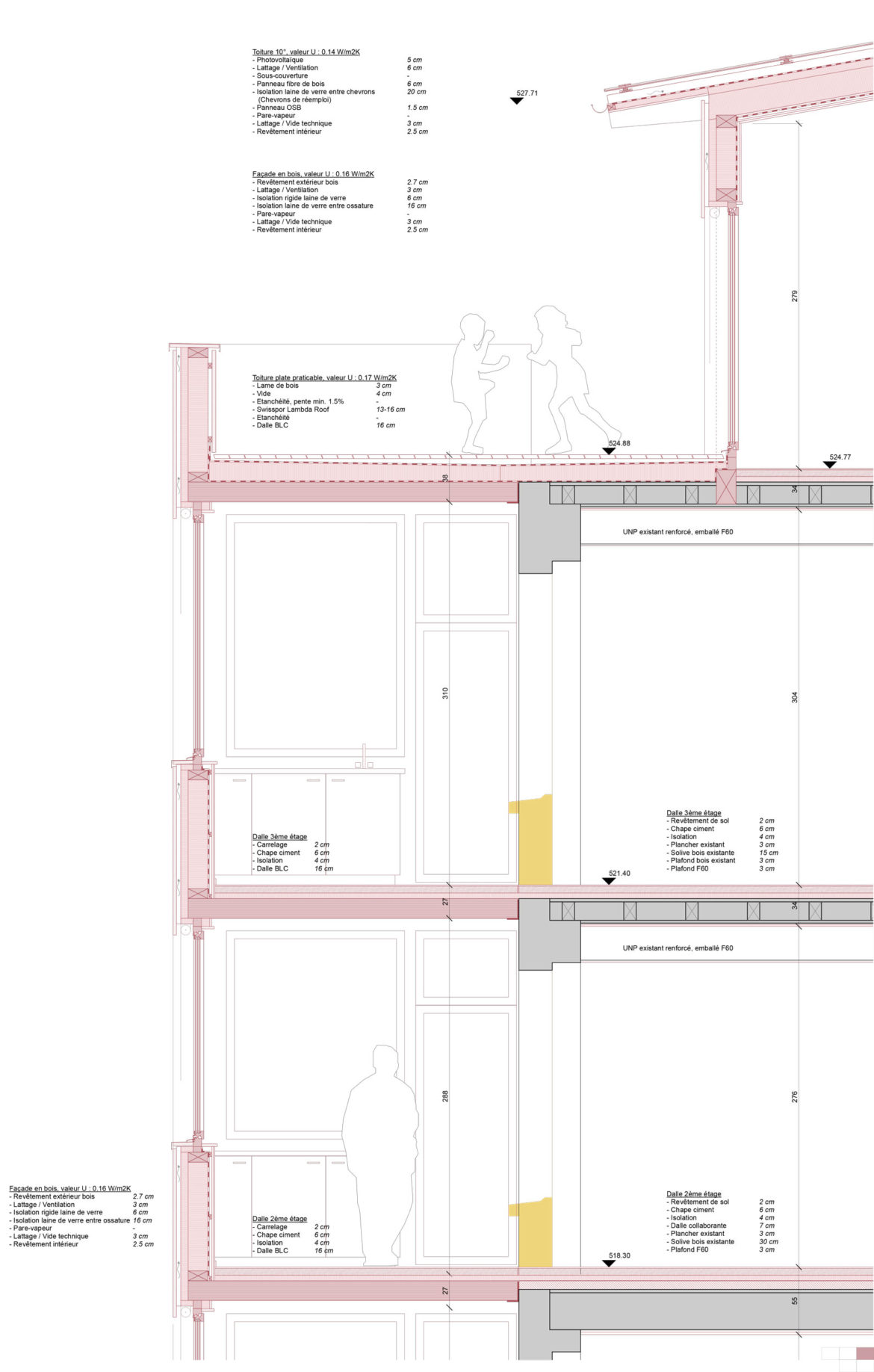 -Pour la partie plus ancienne (1901); le plancher bois existant est renforcé avec une dalle collaborante minimum en béton.