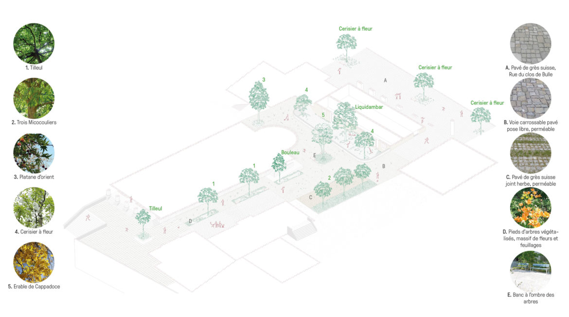 véhicule depuis la rue du Clos-de-Bulle. Ce passage devant être intégré dans le projet, il est déplacé en amont de la rue de manière à préserver un espace vert commun, hors des accès des véhicules, pour les bâtiments et l’église, ainsi qu’un jardin privatif pour la garderie au rez. Cet espace pourra ainsi être planté d’arbres majeurs bénéficiant de la pleine terre et composant un îlot de fraîcheur pour les logements.