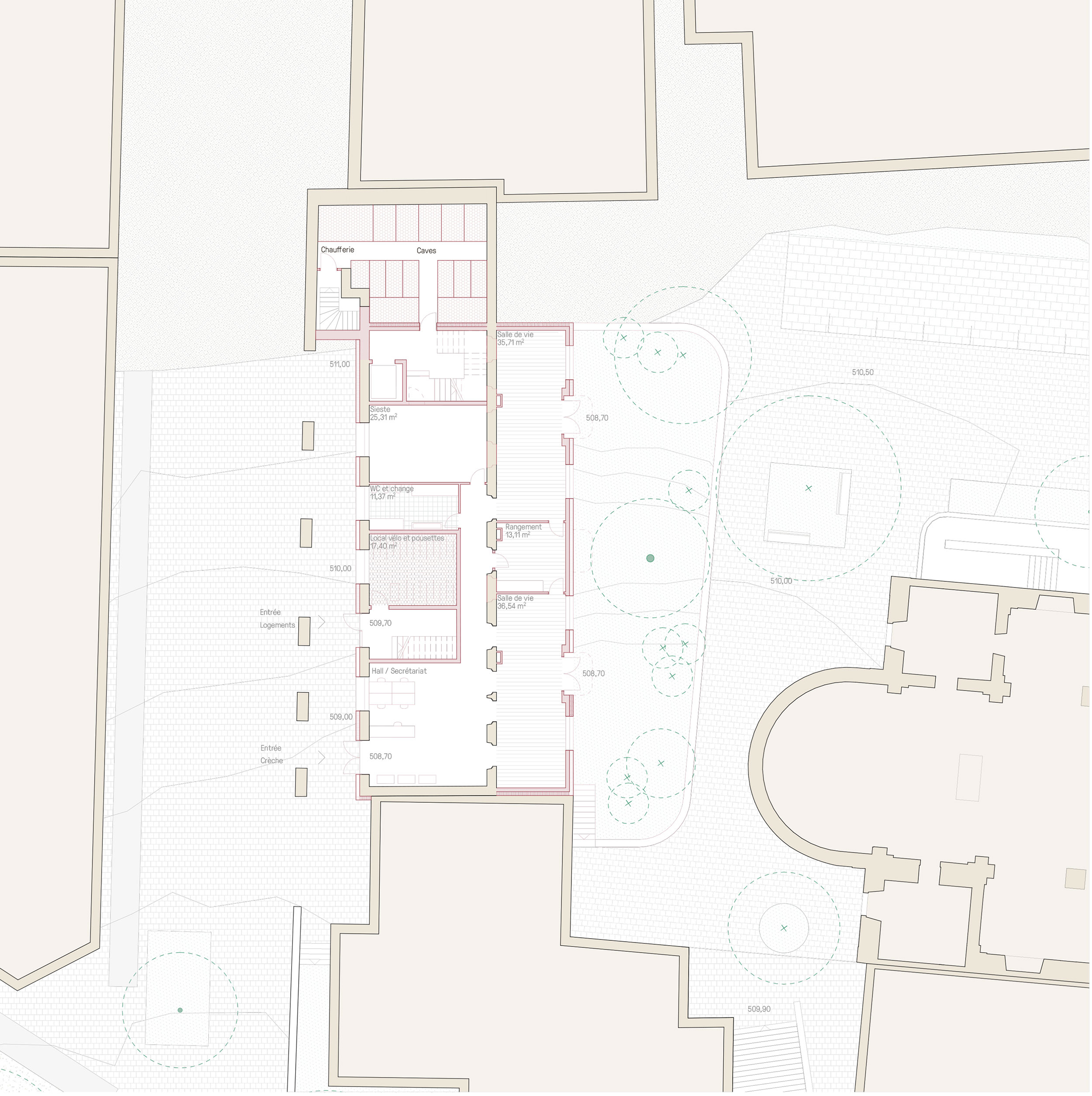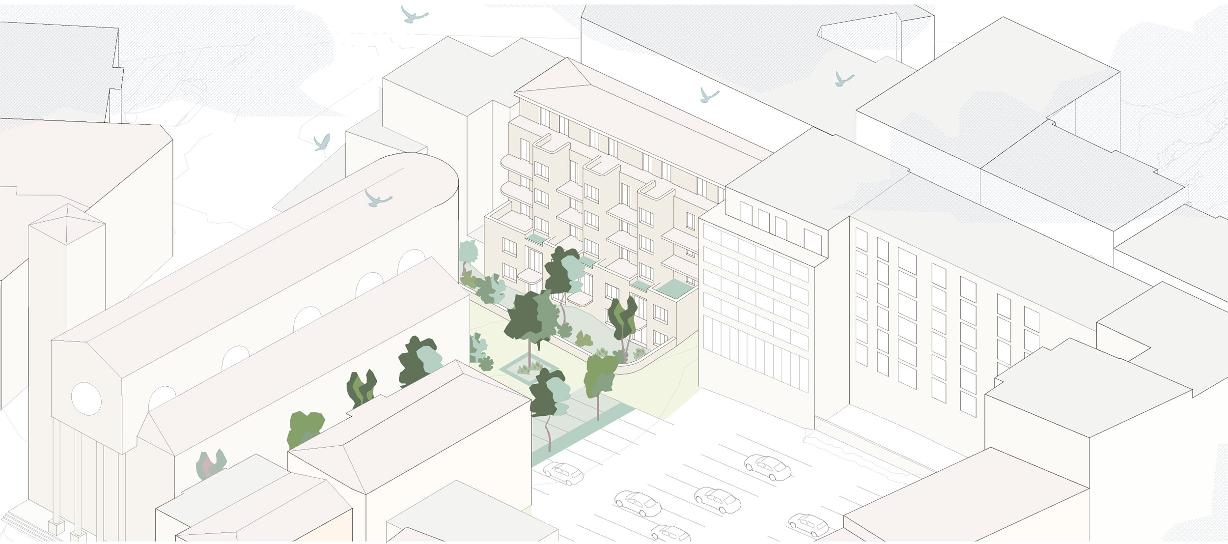 véhicule depuis la rue du Clos-de-Bulle. Ce passage devant être intégré dans le projet, il est déplacé en amont de la rue de manière à préserver un espace vert commun, hors des accès des véhicules, pour les bâtiments et l’église, ainsi qu’un jardin privatif pour la garderie au rez. Cet espace pourra ainsi être planté d’arbres majeurs bénéficiant de la pleine terre et composant un îlot de fraîcheur pour les logements.