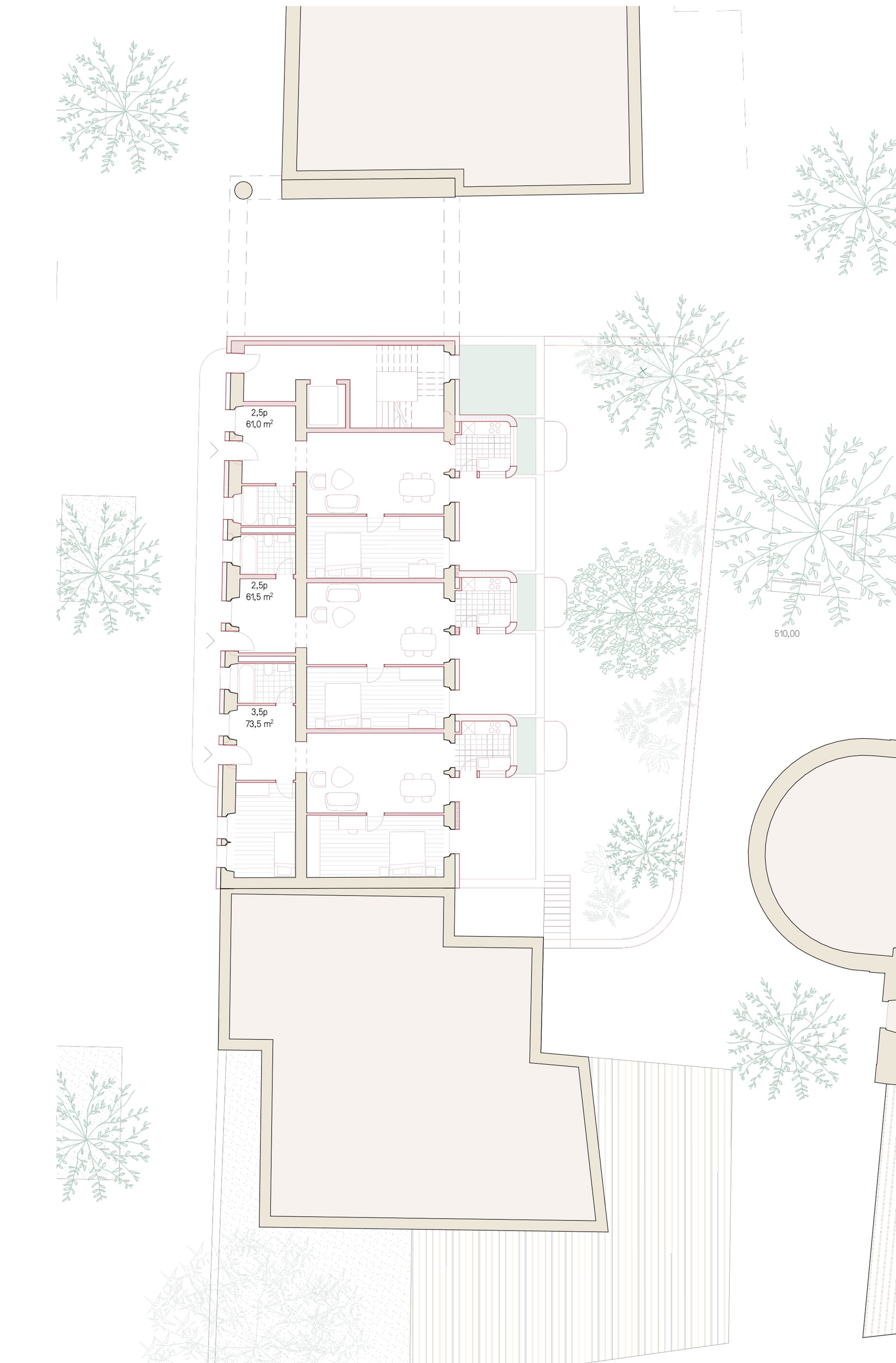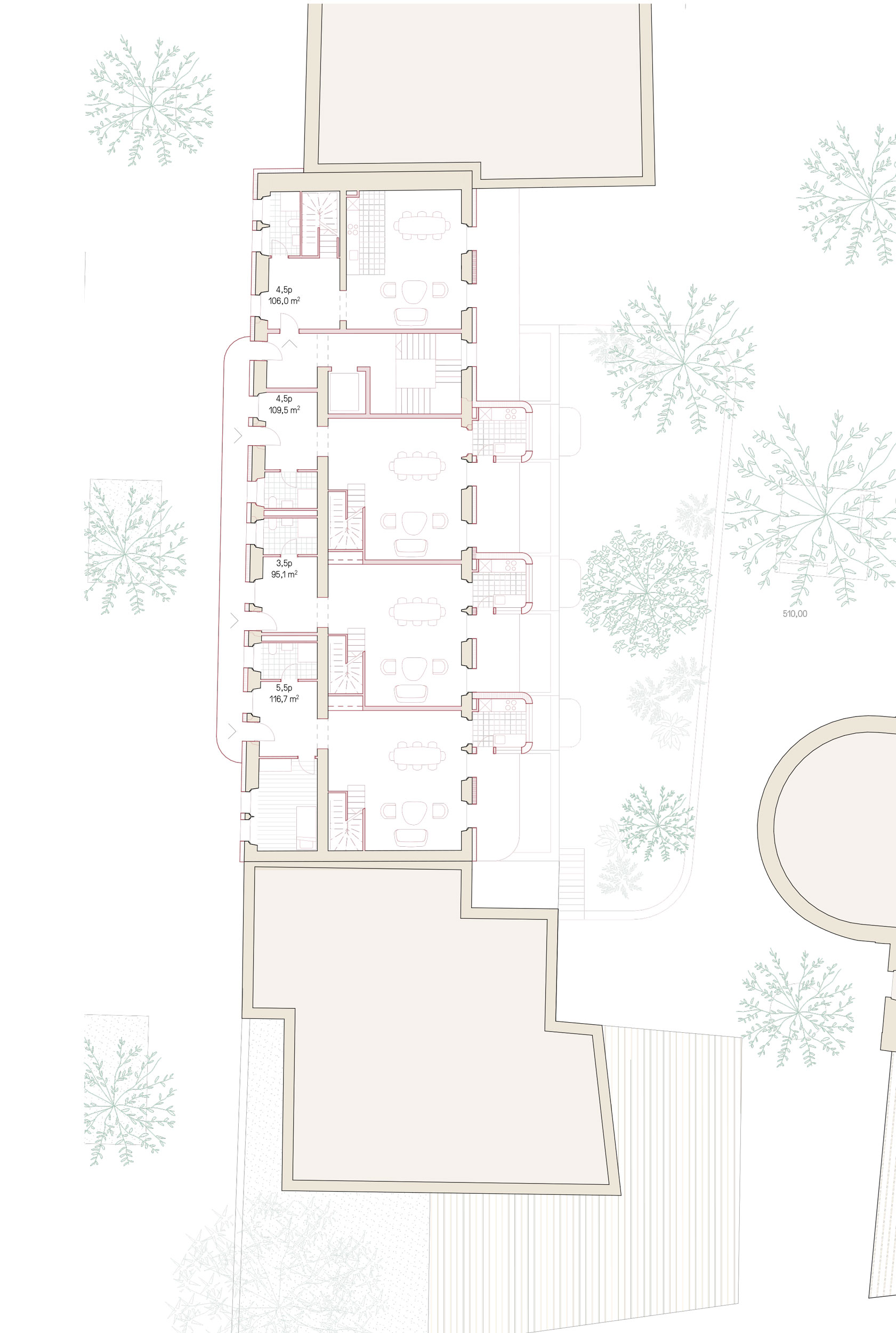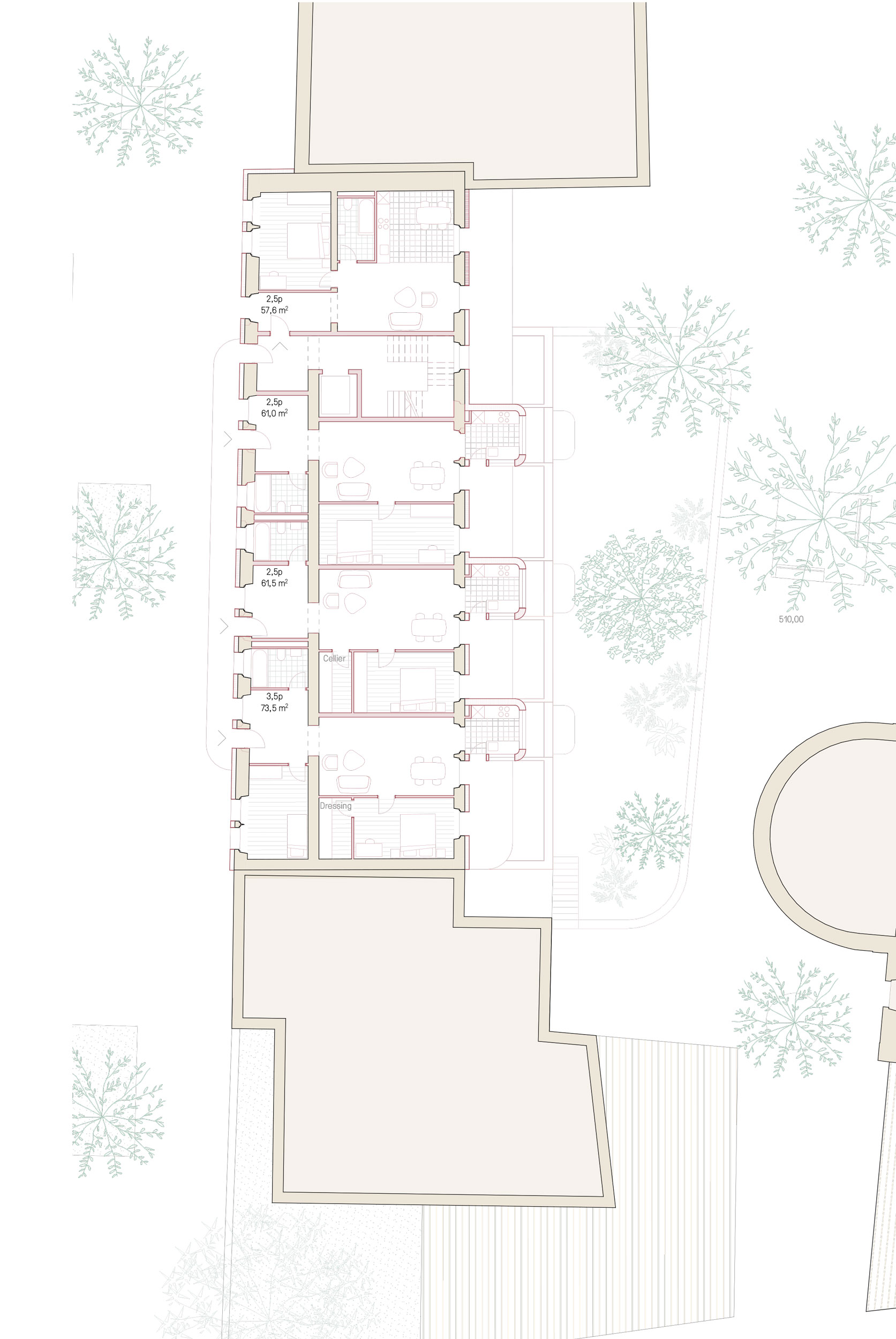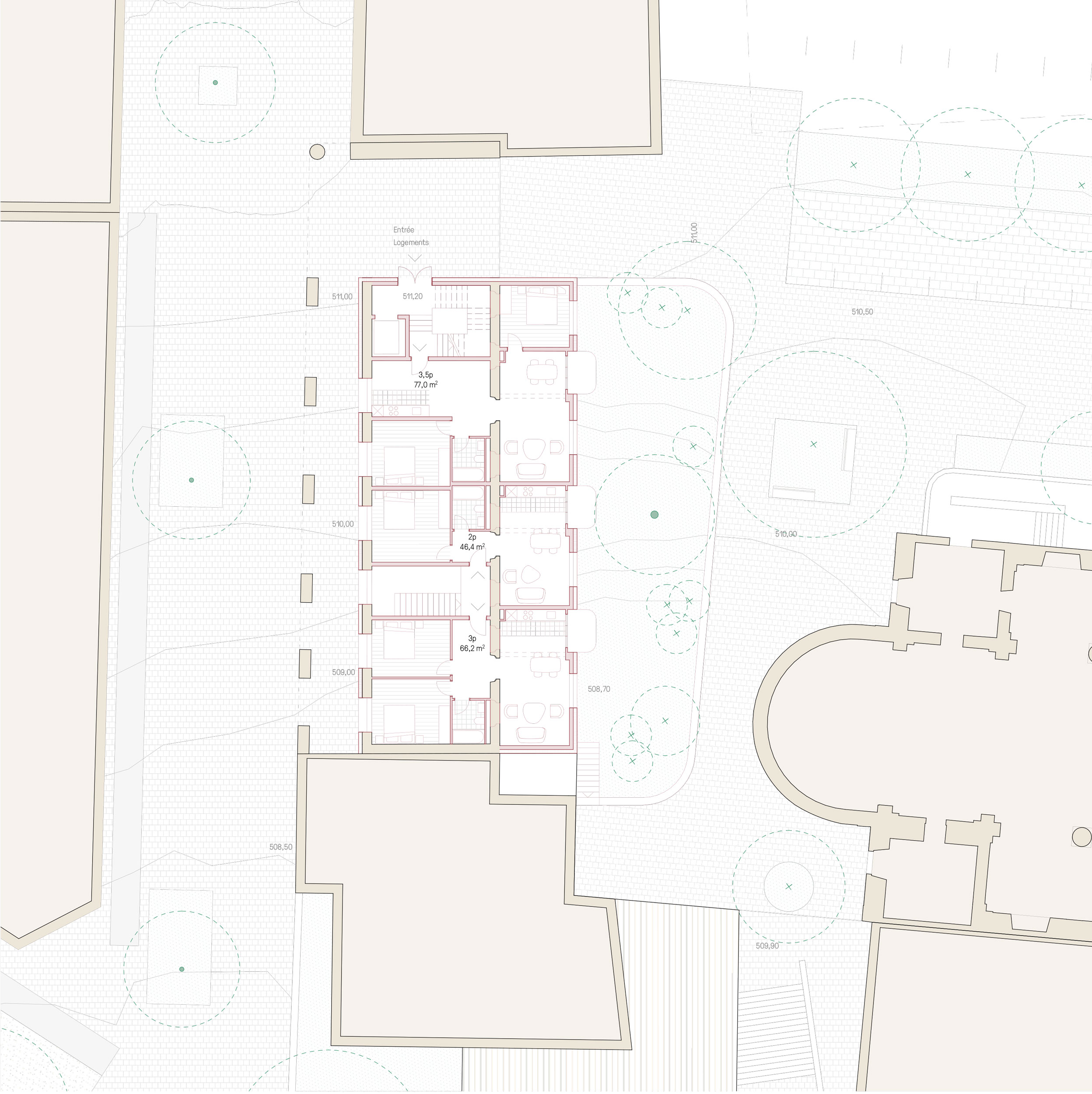 Au rez supérieur, la trame du socle permet d’intégrer les pièces de jour pour trois appartements de 3p, 2p et 3,5p. les deux premiers ont une entrée indépendante sous le couvert.